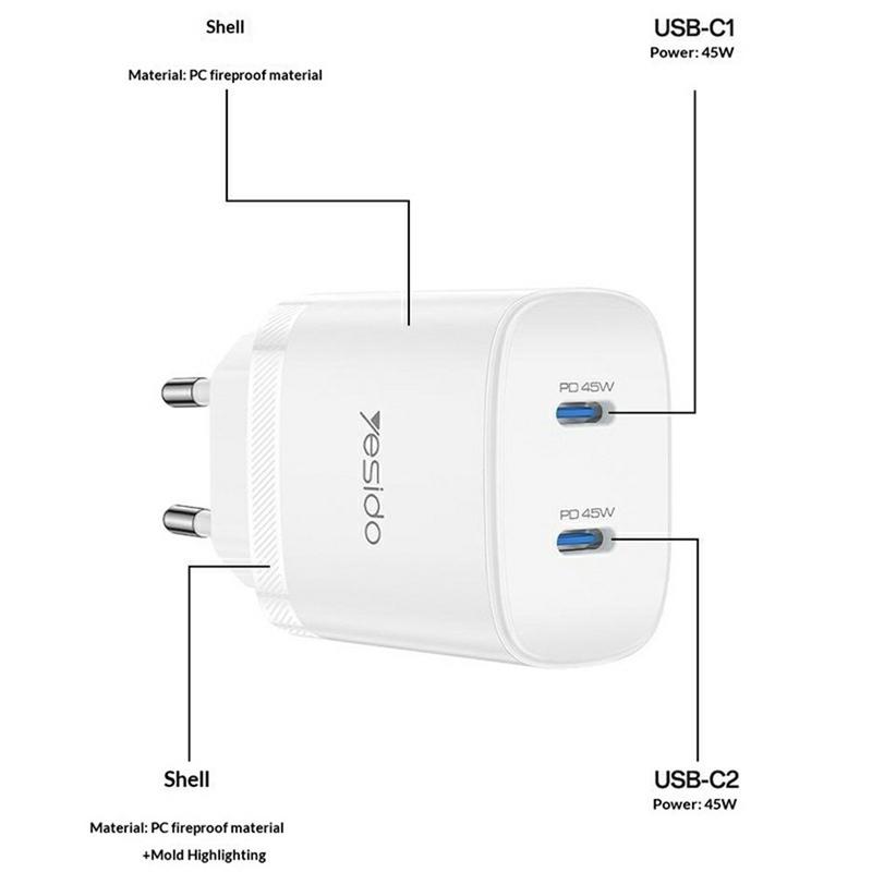 Carregue dois dispositivos ao mesmo tempo com o conjunto de carregadores Yesido YC109 45W dual USB-C PD, projetado para carregamento rápido e eficiente em casa, no trabalho ou na sua mala de viagem. Com saída máxima de 45W e suporte PPS (Programmable Power Supply) moderno, ele pode fornecer carregamento otimizado para smartphones, tablets e outros dispositivos USB-C compatíveis, ajudando a acelerar a recarga enquanto gerencia a energia de forma inteligente. Duas portas USB-C permitem carregar vários dispositivos simultaneamente, e o cabo USB-C para USB-C incluído significa que está pronto a usar assim que sair da caixa. O adaptador de parede compacto suporta entrada CA 100-240 V, tornando-o uma escolha prática para viajantes frequentes, e a caixa resistente ao fogo proporciona tranquilidade no dia a dia.