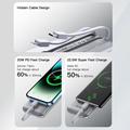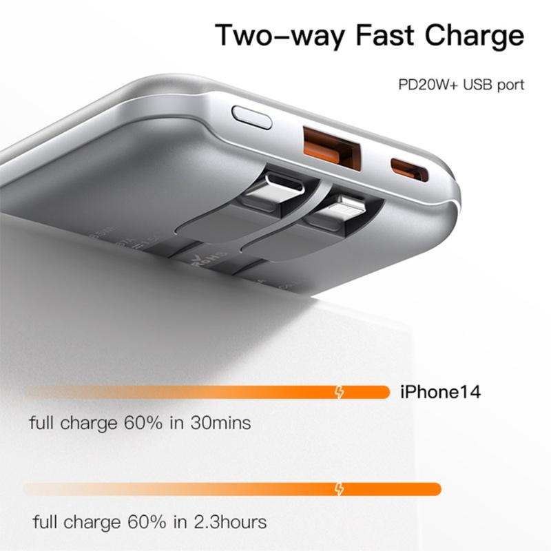 Equipado com 2 cabos para iPhone e telemóveis tipo C, basta ligar e o telemóvel será carregado, não sendo necessário preocupar-se com cabos