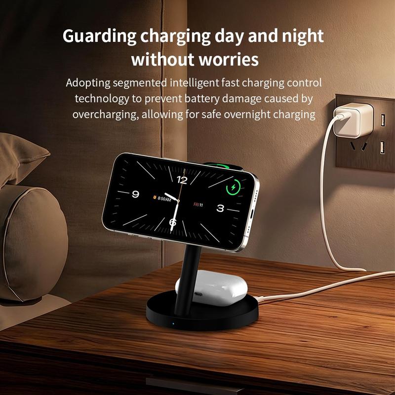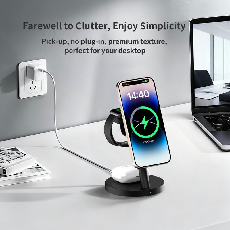 Os carregadores sem fios 3 em 1 são populares porque reduzem a confusão de cabos e tornam o carregamento diário mais prático. Os suportes de carregamento magnéticos são especialmente úteis porque ajudam a posicionar o telemóvel na posição correta mais facilmente do que uma base de carregamento plana. Os modelos com suportes ajustáveis também facilitam a verificação de notificações, a utilização do modo de espera ou a manutenção do ecrã visível durante o carregamento.